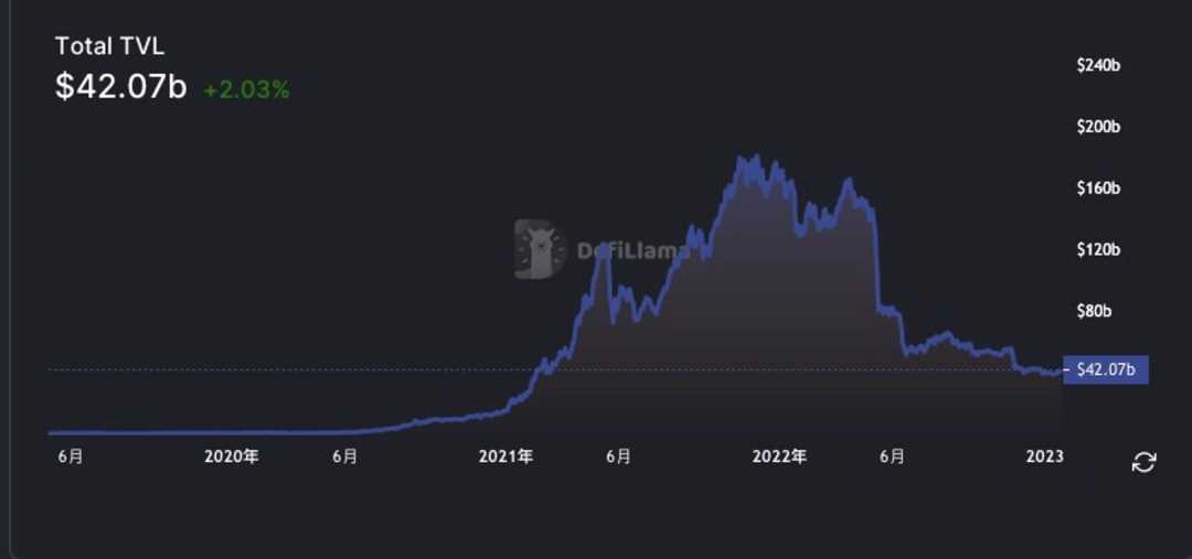 Defillama 资料显示,过去一年,遭受数据加密资产持续下跌产生的影响,DeFi 总锁单量从最大超 1800 亿美金降到约 390 亿美金,减幅超 78%,这和传统资产的规模不能同日而语。