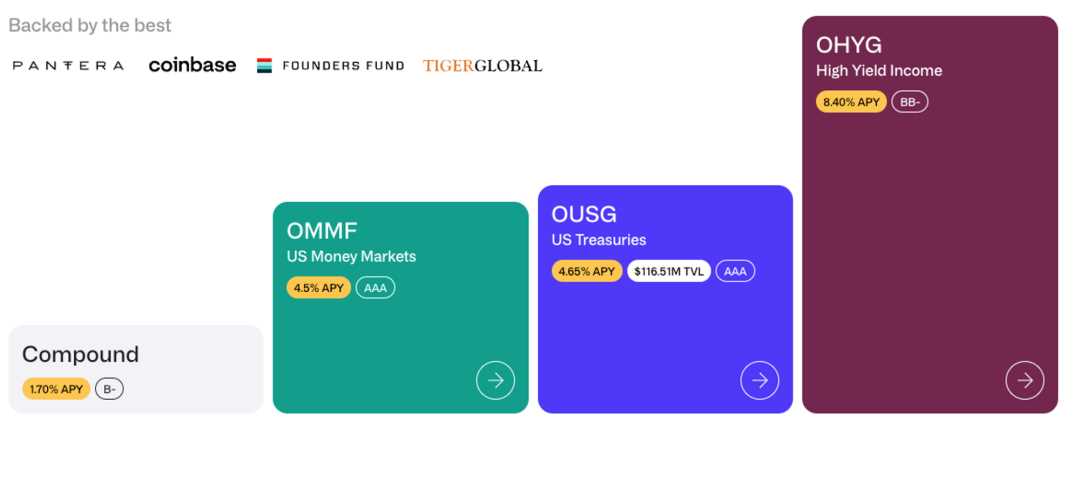 在其中,OUSG 导向美金稳定币,由短期内美债做为抵押物,最开始根据贝莱德国外短期国债 ETF (SHV) 开展,回报率预估为 4.65%;OSTB 将投资于短期理财级企业债券,最开始根据 PIMCO 加强型短期内期满主动式 ETF(MINT) 开展,回报率为 5.45%;OHYG 将投资于高回报企业债券,最开始根据贝莱德 iBoxx 高回报公司债券(HYG)开展,回报率为 8.02%。债券投资者能通过区块链智能合约核准的货币化股票基金利益基金净值开展链上出让,Ondo Finance 将扣除每一年 0.15% 的管理费用。