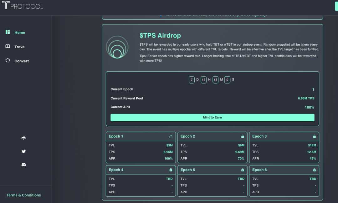 现阶段,TProtocol 刚在以太币主网上线,用户可用 USDC 1:1 mint 出 wTBT 参加早上空投物资鼓励,每一个 Epoch 都是会有明确的 TPS 货币做为初期参加的鼓励。除此之外,TProtocol 还正式上线 Optimism 里的 Velodrome,客户提供流通性获得国债收益的同时还能得到 Bribe 盈利。