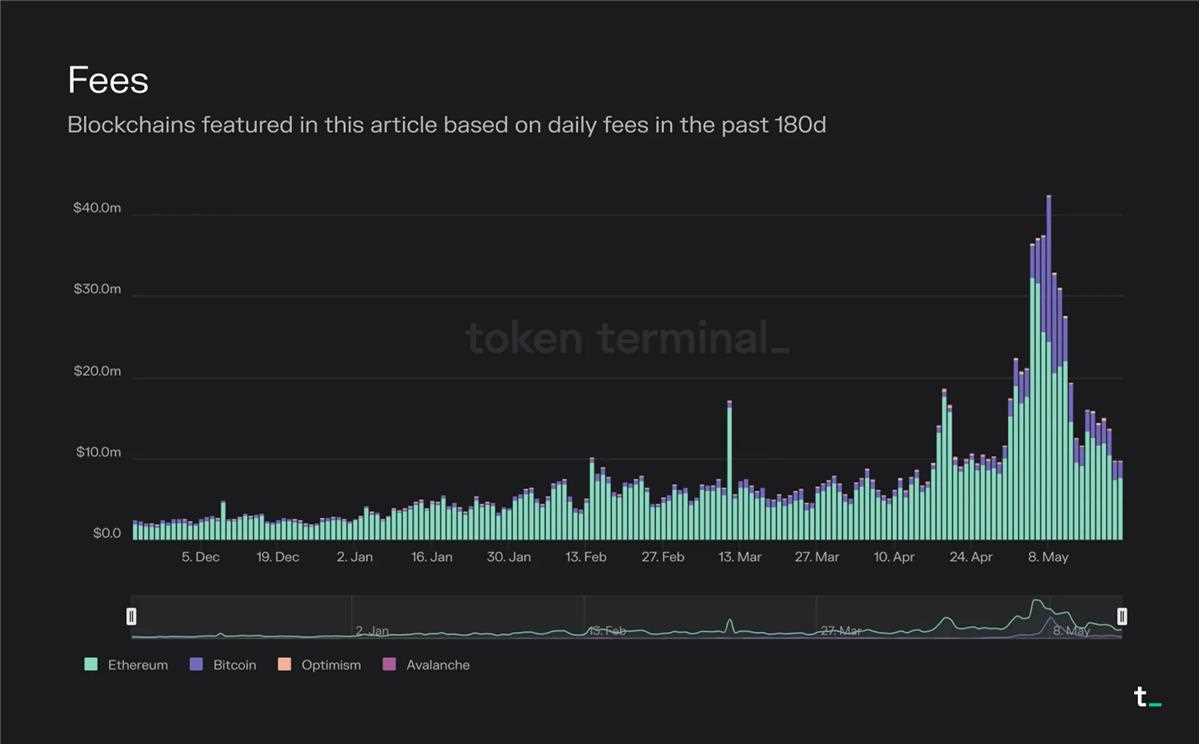 深潮注:能够看见以太币和比特币的交易费用总产量上依然是名列前茅的。