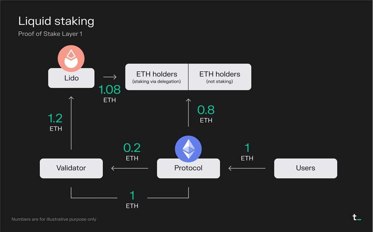 Liquid 质押贷款协议书提升了客户体验。质押贷款,本质上是一个专业性跟高维护保养性的过程,早已被像Lido这种协议书优化了。根据用户可以锁住他的 ETH 并接受可转让好用货币 (stETH),Lido 推动了无缝拼接质押贷款,同时让用户可以得到与认证主题活动有关奖励。为了能给予这项业务,Lido 从总收益中获取 10% 费用。这个费用在连接点网络运营商和 Lido DAO 中间均分。