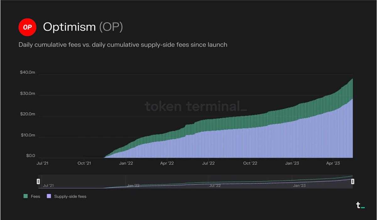 自互联网上线以来,Optimism 里的客户共付了 3820 万美元交易费用。在这笔费用中,有 2850 万美金用于购买向以太币递交买卖交易gas费。