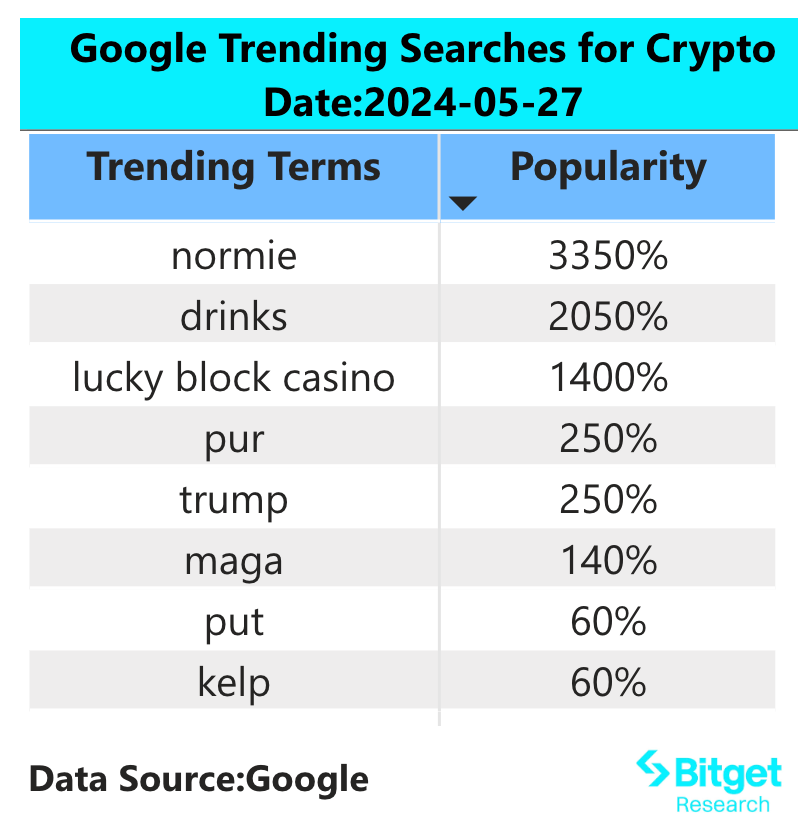 收到本周以太坊 ETF 通过的影响,整体加密行业对于 ETH ETF、BTC ETF 的搜索量显著上升。同时以太坊生态相关的项目,例如 LSD 赛道、LRT 赛道等均收到了不同程度的关注,说明用户在关注以太坊本身的同时,也在关注以太坊的质押生息方式。
