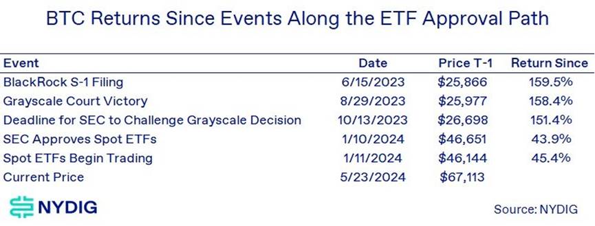 该机构的批准是其态度的一个突然转变,这是包括我们在内的许多人在一周前没有预见到的。值得注意的是,美国证券交易委员会的委员们并没有像对待比特币 ETF 那样对这个问题进行投票,交易和市场部门是批准 19b-4 的实体。不过,如果没有委员们的支持,它可能不会这样做。我们对这种情况的理解是,事情在周一 (5 月 20 日 ) 突然发生了变化,这可能是为了应对如上所述的加密货币监管和法律环境的变化。在此之前,美国证券交易委员会对加密货币的态度并不欢迎,只有在法庭上败诉后才允许现货比特币 ETF。在 5 月 23 日现货以太坊 ETF 批准截止日期之前,没有迹象表明监管机构倾向于批准,因为它没有与潜在发行人举行任何会议,而在现货比特币 ETF 批准之前,它已经举行了 24 次此类会议。以太坊开发公司 Consensys 甚至不遗余力地起诉监管机构,声称它正准备将以太坊的原生资产以太币 (ether) 归类为证券,这将有效地终结 33 年法案 ETF 的任何希望。