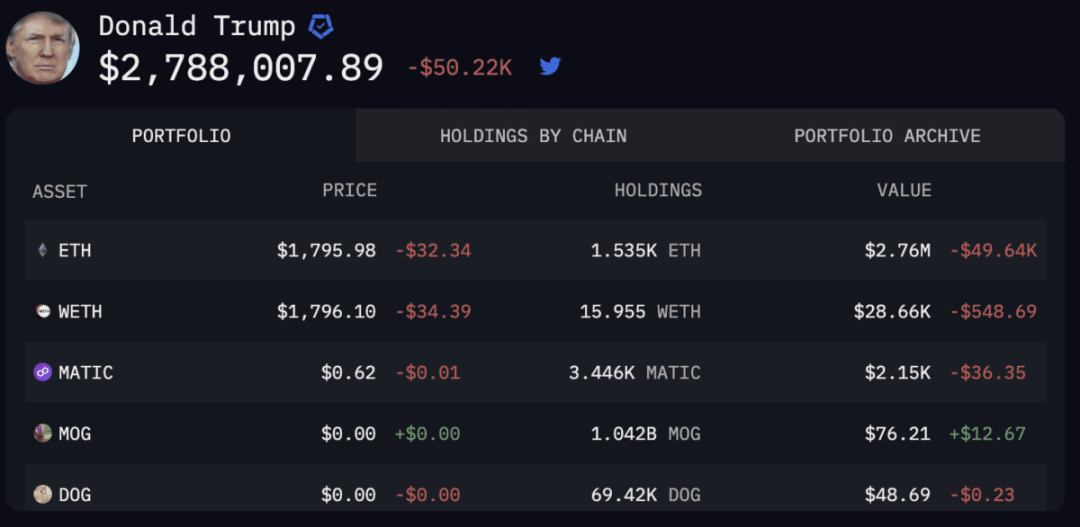 他在 2022 年 12 月 16 日推出的 NFT 项目——特朗普数字藏品卡,全部卖光后获得了总计 487 万美元的收益。而在疑似他本人的加密钱包中,据华盛顿非营利组织公民责任与道德组织 (CREW)2013 年 8 月 14 日披露,还持有高达近 280 万美元的加密资产(ETH)。