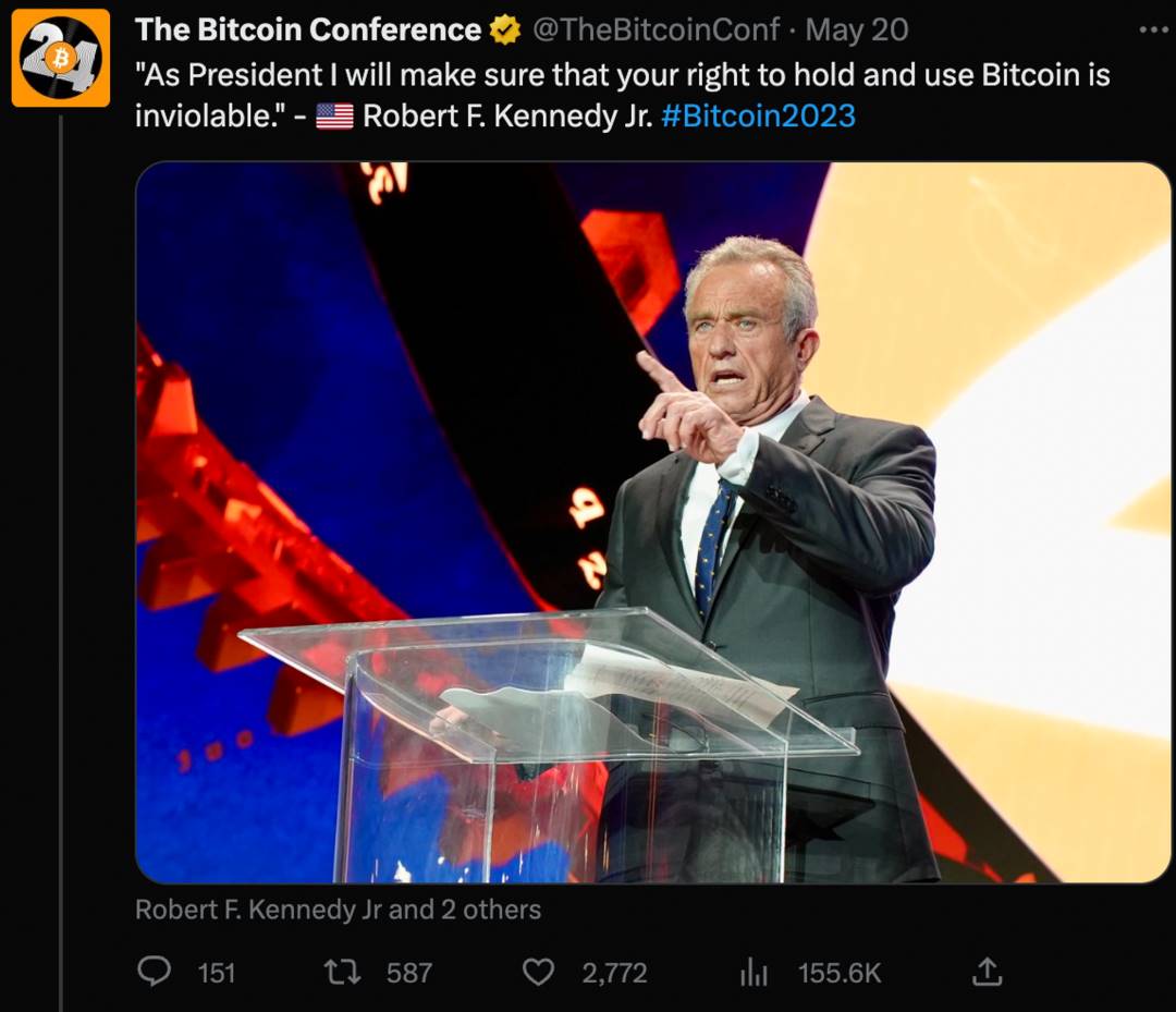 2023 年 7 月 24 日,小肯尼迪参加了在迈阿密举行的比特币会议,并宣布他的竞选活动将是「历史上第一个通过闪电网络接受比特币捐赠的总统竞选活动」 。