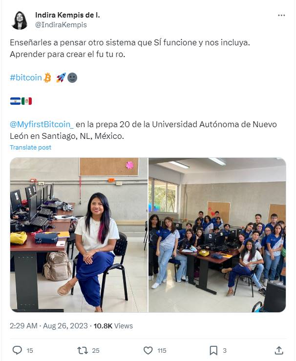 她还积极参加了一些加密相关活动,例如在 2023 年 8 月份她出生的新莱昂省,她参与推进了「我的第一个比特币」课程的相关认证。
