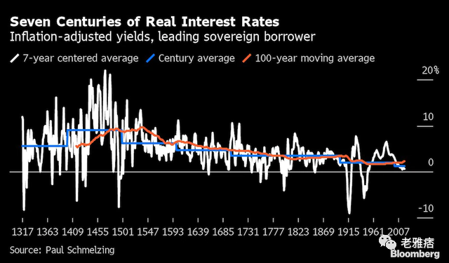 "Schmelzing写道:"全球实际利率......在[五个]世纪里,遵循着一种'温和'的持续下降趋势,每年下降1-2个基点。" 他认为,自文艺复兴以来,实际利率为负的时期远非罕见。"处于零下限的全球实际利率与深刻的历史趋势完全一致--从长远来看,过去40年的利率在石油冲击的背景下达到异常高的水平后,实际上已经恢复到了趋势。"