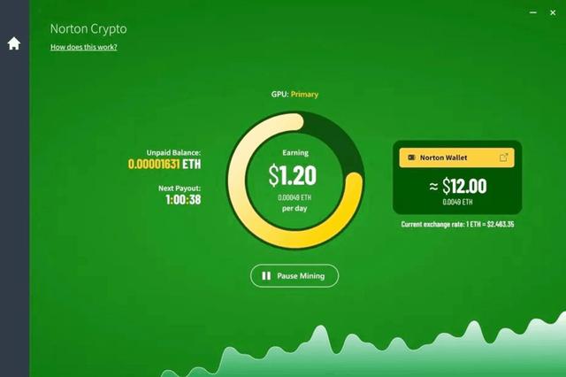 其次是关于启动的解释,诺顿方面表示只有在主控制页上,右上角绿色部分的“Turnyour PC’s I-DLE time intocash”点击同意后才会在电脑空闲时间进行挖矿,而且可以随时停止。不过事实是很多人并不知道这个是干啥的,默认为是杀毒有用的东西,从而神不知鬼不觉地运行很长一段时间。