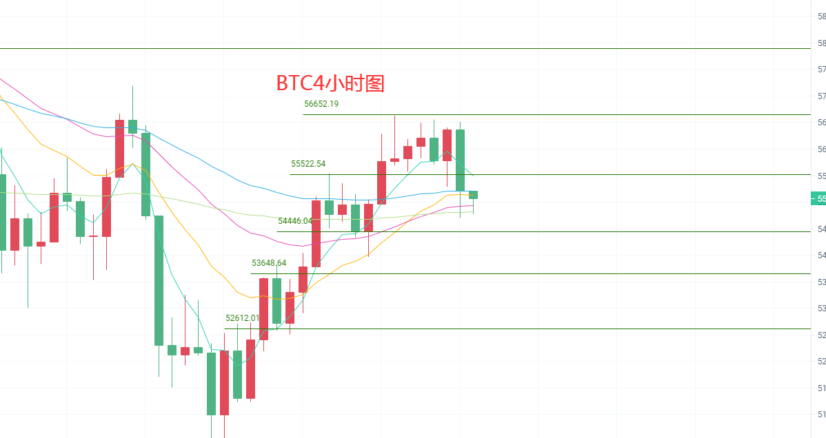 昨日我说道比特币再现三角关口并没有出现破位,而是三角口开始收缩,日线我们可以看住波动不是很大,K线冲击布林带中轨(56300)以后开始来回震荡,KDJ向上发散,MACD顶背离周期越来越长,放量减少以后DIF和DEA开始高位线下发散,移动平均线目前只有EMA5和EMA15交叉苦苦支撑在54800-55000双支撑关口,这也是目前技术面横盘震荡的重要因素