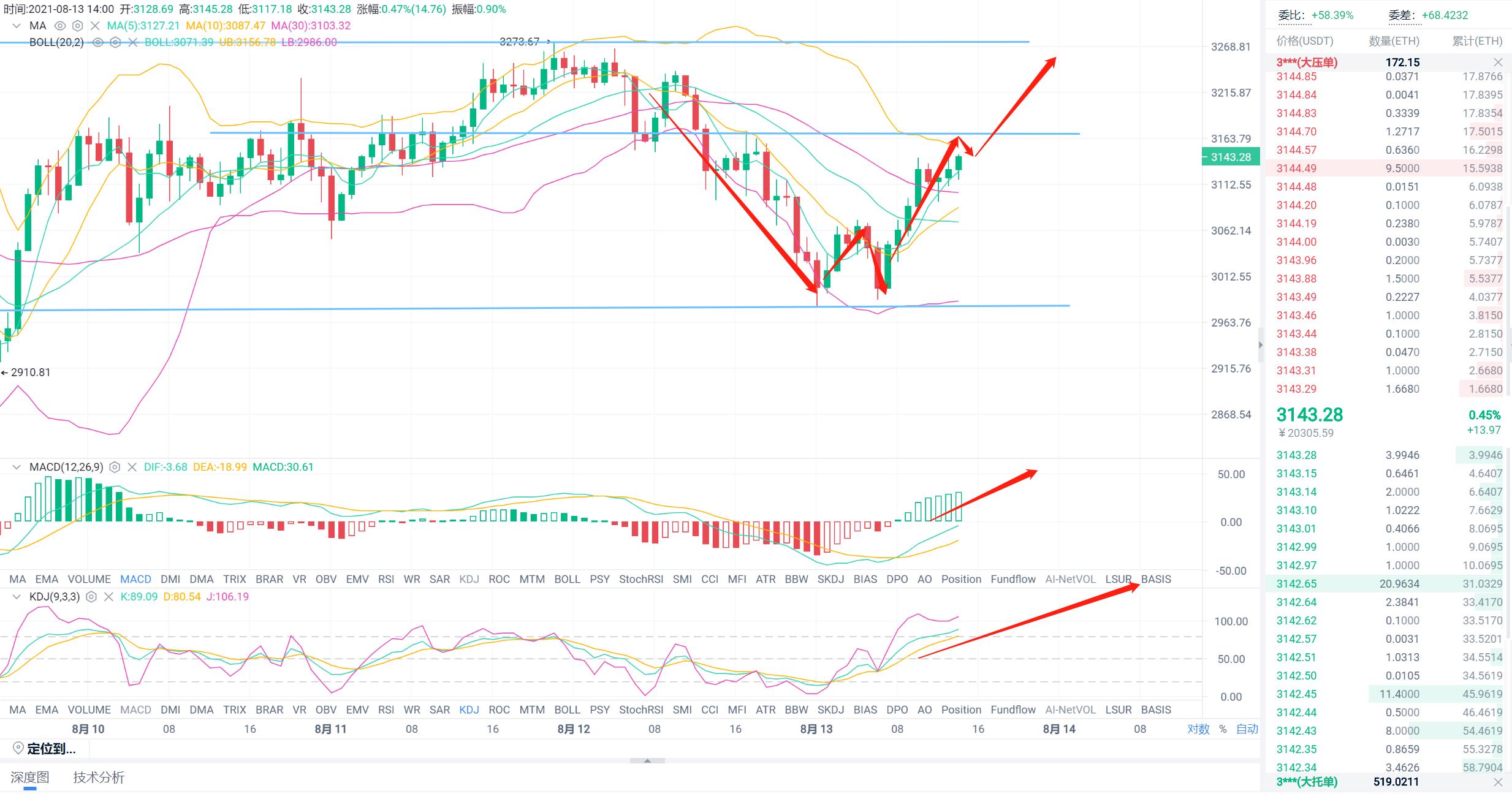 再来看看以太坊的行情,在昨天最低触及到了2980之后进行止跌反弹,目前已经重回了31,000上方,从小时图来看空头趋势在减弱,指标有转多头的趋势,价格维持在一个区间盘整,重点关注3080~3150。在本周我是不太看好以太坊的行情会有大的突破,不管是多头还是空头,大概率会维持一个震荡走势,盘整一段时间。在策略上仍然是没有太大的改变。下方在3000附近可以进场多单,上方的3250~3280可以进场空单。如果说是行情来到了3050附近空仓看好多头的朋友,可以极小仓位进场一次多单。