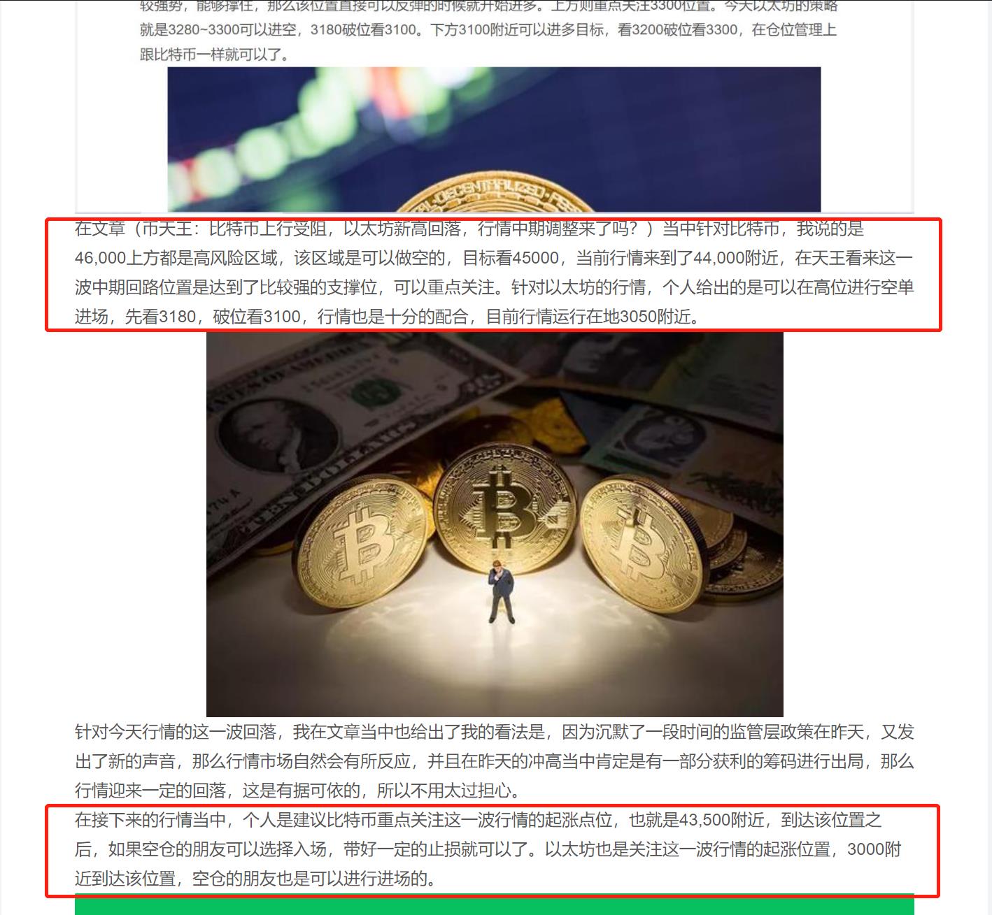 昨天天王写了两篇文章,都是全网公开的早间的第1篇我做了一个吹哨人,在文章(币天王:比特币上行受阻,以太坊新高回落,行情中期调整来了吗?)当中直接阐明了昨日是必跌的。相信关注者的现货朋友应该能够规避掉一些风险,而做合约的朋友应该也能拿到不错的做空利润。而在晚间很多人都在说行情会瀑布的时候,天王在文章(币天王:中期回落如期而至,午间文章精准把握,后市怎么做?)却是在下方的43500附近给出的比特币做多的策略,当前行情来到了45270已经获利超过1500个点。而以太坊的行情,我给出来的是在3000附近进行多单进场,目前行情达到了3130,获利达到了130个点。什么是自信?这就是自信,每天盯盘18个小时,任何行情都能做到心中有数。如果对于合约交易实在是把握不准的朋友,可以来天王这边,我来带你翻身。