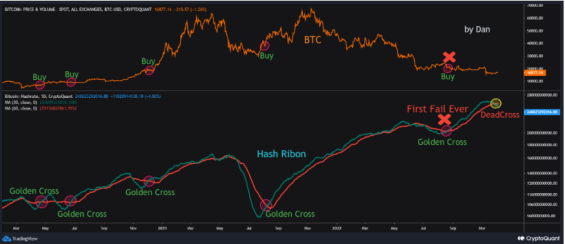 2022-12-06 有史以来第一次,比特币散列丝带金十字失败了! 链上数据显示,比特币散列丝带黄金十字有史以来第一次未能提升价格。正如一位密码分析师指出的邮政,BTC散列带模型在加密史上第一次失败了。