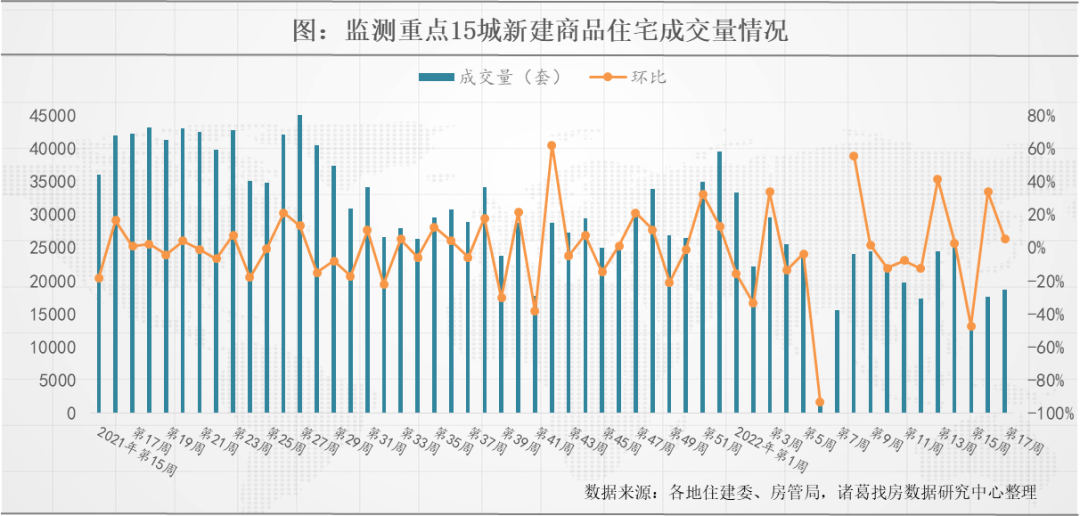 核心结论: 2022年第17周监测重点城市新建商品住宅成交量环比上涨5.46%,二手住宅成交量环比上涨10.83%。从新房成交来看,8城新建商品住宅成交量环比上升,7城新建商品住宅成交量环比下滑。成交量上升城市中,武汉本周成交2975套,环比上涨39.80%,位居涨幅首位;其次为青岛,随着疫情好转市场交易逐步回归正常,成交量亦回升,环