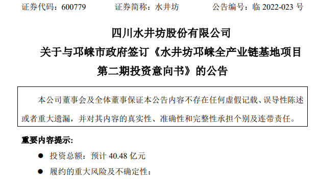 日前,水井坊发布公告,与邛崃市(县级市,成都代管)签订《水井坊邛崃全产业链基地项目第二期投资意向书》。 预计投资40.48亿元,建设包括酿造基地、瓶装酒包装中心、仓储物流基地、国家实验室、新产品研发中心等。水井坊目标高远,窜得很高。 该项目预计占地面积约735亩,预计净用地投资强度不低于408万元/亩。 按说这是重大利好,但是大家发现