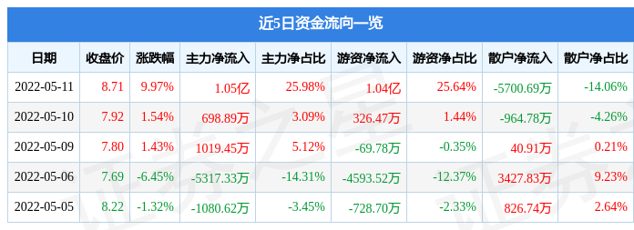 国盛金控涨停收盘,收盘价8.71元。该股于9点43分涨停,未打开涨停,截止收盘封单资金为7625.14万元,占其流通市值0.54%。资金流向数据方面,5月11日主力资金净流入1.05亿元,游资资金净流入1.04亿元,散户资金净流出5700.69万元。近5日资金流向一览见下表:该股为券商,大金融,区块链概念热股,当日券商概念上涨0.4%,