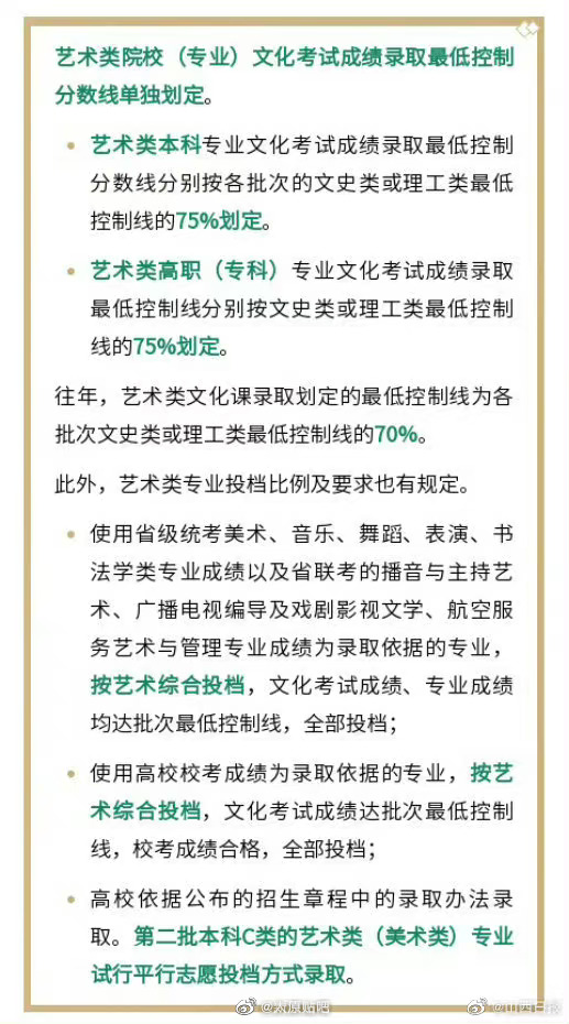 本报讯 6月4日,省招考中心公布了《山西省2022年普通高校招生工作规定》,同往年相比,今年政策有所微调,艺术类文化课成绩录取最低控制线提高。 艺术类院校(专业)文化考试成绩录取最低控制分数线单独划定。艺术类本科专业文化考试成绩录取最低控制分数线分别按各批次的文史类或理工类最低控制线的75%划定。艺术类高职(专科)专业文化考试成绩录取