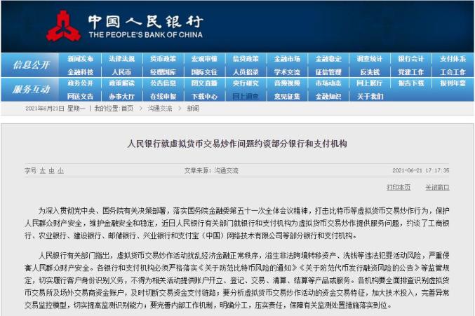 人民银行官网6月21日发消息,近日人民银行有关部门就银行和支付机构为虚拟货币交易炒作提供服务问题,约谈了工商银行、农业银行、建设银行、邮储银行、兴业银行和支付宝(中国)网络技术有限公司等部分银行和支付机构。