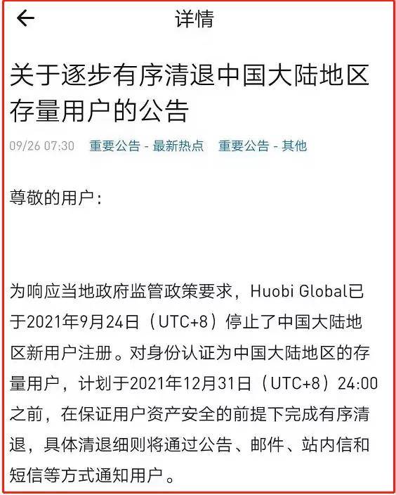 在人民银行和发改委的两条通告发布之后,火币于今天下午发布了公告:将停止大陆新用户的注册,并且会对大陆身份认证的存量用户进行清退,期限在2021年12月31日之前。