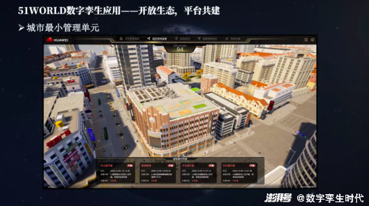 第二个,是在雄安新区的建设中,生态上下游一起了定义未来的协议和标准(XDB)等。第三个,深圳的一个港口案例,在这个案例中,我们循序渐进地为产业创建价值:以数据驱动港口,然后去模拟港口,接着基于运营模式做出智能决策,最后去反向控制港口上的各种设备设施。最后一个,是我们与华为一起做的城市最小管理单元案例。这个案例中,大部分know-how的内容,由51WORLD生态合作伙伴华为建设,但数字孪生场景部分及平台接口,由51WORLD完成。?