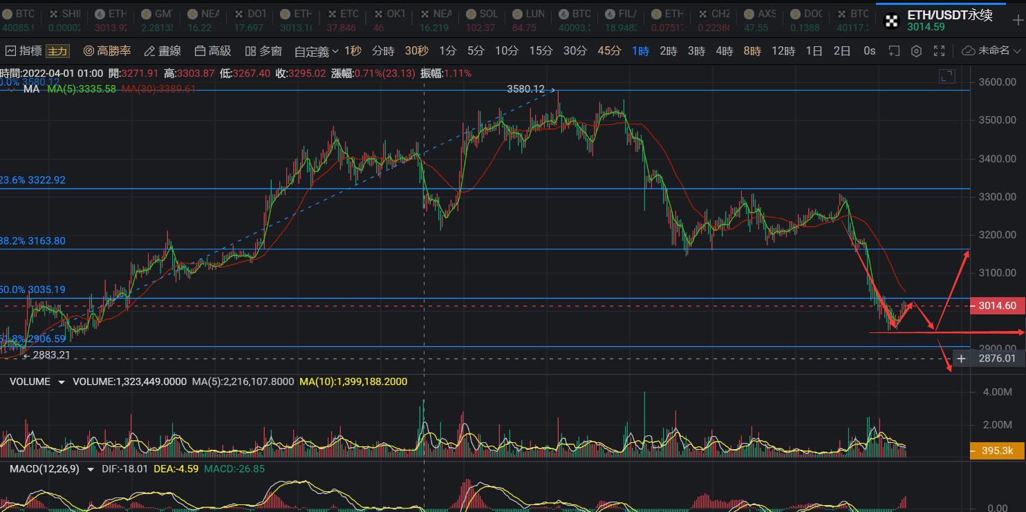 以太坊表现也相差不大,区别就在于自前期高点下跌的空间没有大饼那么大,但是整个趋势来看也是走出了一个深度回调出来了,回落看待的话下跌的幅度也较为可观,短期内下方的3000关口位置同样是一个市场的心理预期的位置,这里没能放量快速破位的话,依然也有可能在这个位置形成反转走阶段性反弹的上涨,昨日下跌最终没能跌破2900关口也是一个市场力度不够明确的表现,真要是空头力量足够强势应该是会借着昨天的空头情绪去测试一下2900这个61.8%的斐波那契回撤位,但是并没有,说明空头力量还不够强势,前面大跌走出来破位之后,行情不再延续,本身就是一个空头动能衰减的表现,因此今天对于以太的思路也是同样的看触底反弹去抄底尝试做多的机会。下方关注昨2900一线支撑位置的有效性,依托昨日低点2950去做短线抄底多单布局就好,行情跌破2900关口则放弃抄底。