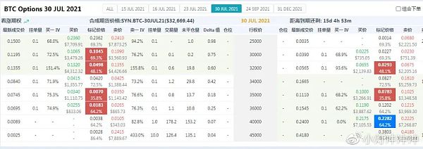 Greeks.live汉化的期权报价表(测试网)假设交易者在这个账户中持有1个BTC的保证金,并且卖出1张BTC-30Jul21-34000-C看涨期权,作为标的的7月30日到期的期货到期时价格分别落在34000美元以下,和落在34000以上造成的影响分析如下:
