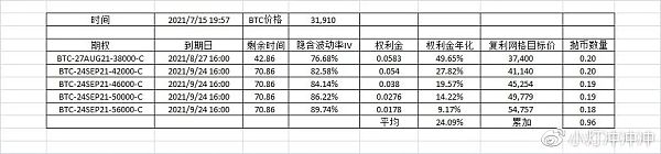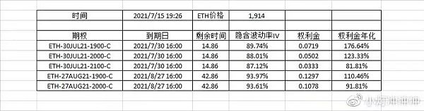现在是2021年7月15日晚上7:26分,以太坊的价格、部分期限看涨期权的权利金及其年化比率展示如下: