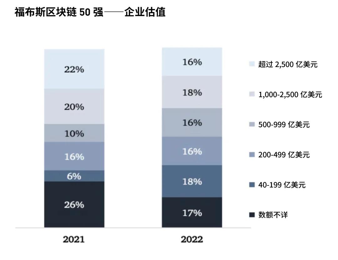 毫无疑问,区块链企业已经从央行宽松货币政策推动的泡沫市场中受益,但过去几个月里,加密货币和股市的调整让泡沫有所消退。今年上榜的区块链50强的总市值为6.3万亿美元,比去年的9.7万亿美元减少了35%。今年上榜企业的市值中位数为660亿美元,而去年则为1,160亿美元。