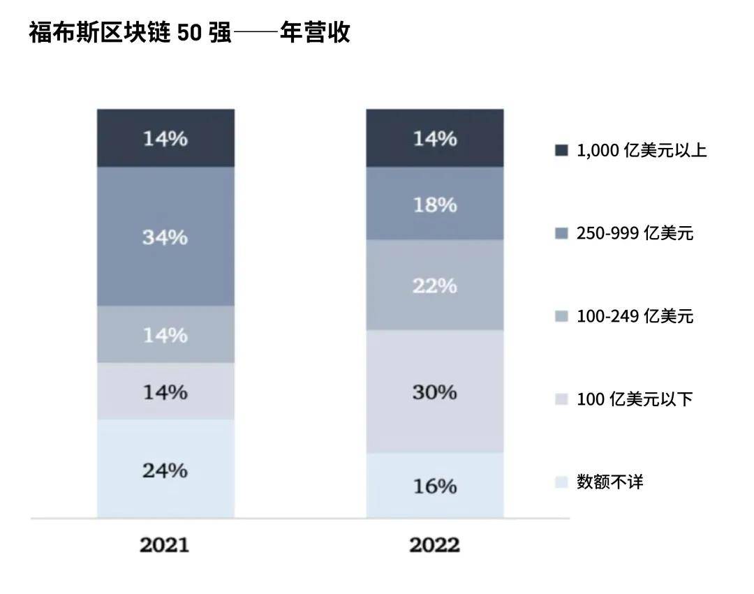 在“2022福布斯区块链50强”榜单中,有54%的公司年收入超过100亿美元,而去年这一比例为64%。今年的年收入中值为189亿美元,而去年为395亿美元。
