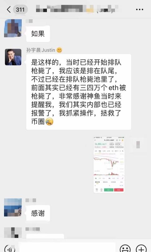 网上流传一张疑似孙宇晨言论的截图,图中,孙宇晨自称护盘使者在群里称:“其实当时(60万ETH)已经开始排队枪毙了,我是排在队尾,前面已经有四万个eth被枪毙了,非常感谢神鱼与内部同事提醒我,我抓紧操作,拯救了币圈。”