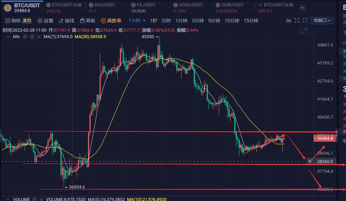 技术面来说,大饼跌破4万关口的强支撑之后反弹无力,上方的4万关口成了反弹上涨的最大拦路虎,昨日震荡一天上去没有触及这一压力位,今日下跌之后的快速反抽上来也没能一鼓作气的触及,那么短期内这里的压力依然可以做为空单入场的参考,小级别反弹不破压力位之前就安心布局空单,下方先不说破位,再探一探前期低点38500一线是没多大问题的,小级别的空间还有,就继续顺势做空。操作思路,利用大饼向40000关口反弹的机会分批布局空单,止损带5000点,目标先看38500一线,破位的话则继续下看37000一线的前低点。