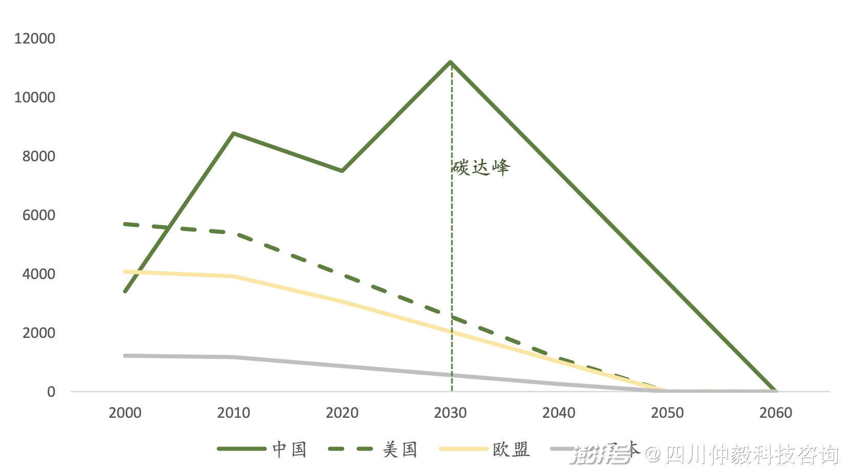 在国际环境中,欧盟和美国表示在2050年实现碳中和。然而,欧盟已于1979年碳达峰,美国也于2005年碳达峰,分别有71年和45年的时间从峰值走向净零排放。而我国作为世界上最大的发展中国家,在2030年碳达峰、2060年碳中和,仅用30年从峰值降至零排放,中国的中和斜率会远陡峭于欧美,这意味着减排速度要超出欧盟一倍,未来四十年我国将面临巨大的“碳约束”和“碳压力”。