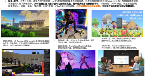 元宇宙的开端:从科幻走进现实,不论是Roblox UGC 3D虚拟世界的新内容呈现方式,Fortnite举办的线上演唱会,还是动物之森和