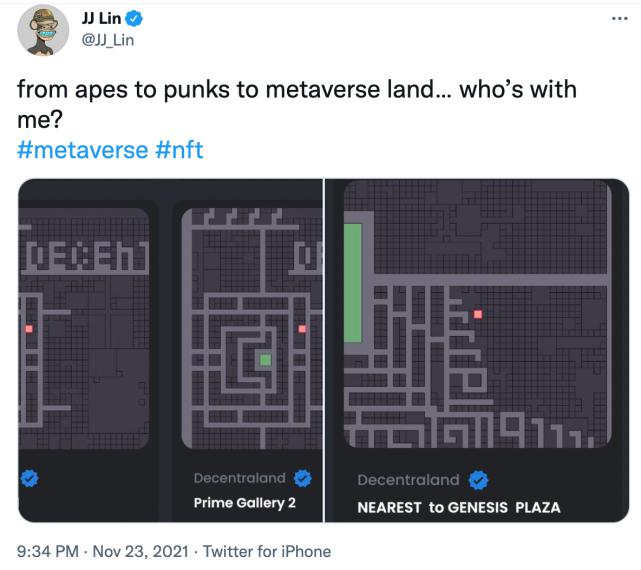 更有甚者,《Decentraland》还可以"炒房"。著名歌手林俊杰就在推特上宣称,自己作为Decentraland的玩家,在其平台上以12.3万美元的价格购买了三块虚拟土地。