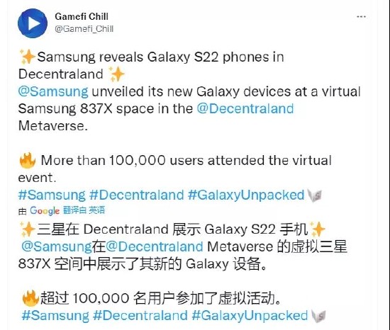 本次发布会三星通过全新的方式展示三星Galaxy S22系列,且拥有超过10万名用户参加了该虚拟活动。首次在虚拟世界中召开发布会便达到了10万人次,且众多网友表示在837X内寻找到了众多NFT。