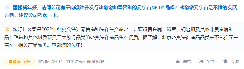 虽然在最新的对投资者回复中,元隆雅图并没有明确表示在冬奥期间会上线售卖元宇宙NFT相关产品品类。但按照目前的发展态势,未来发布“冰墩墩”的NFT数字藏品或围绕其打造元宇宙产品,应该也并不是太难的事情。