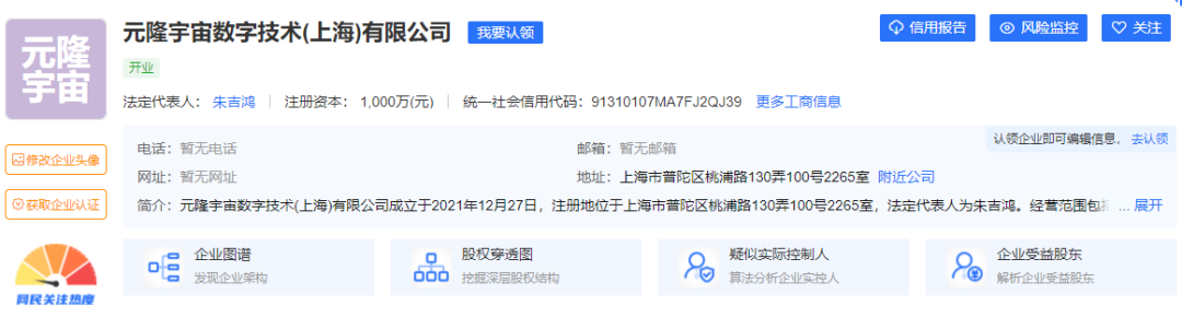 据爱企查数据显示,去年12月27日,元隆雅图成立了“元隆宇宙数字技术上海有限公司”,元隆雅图100%持股。