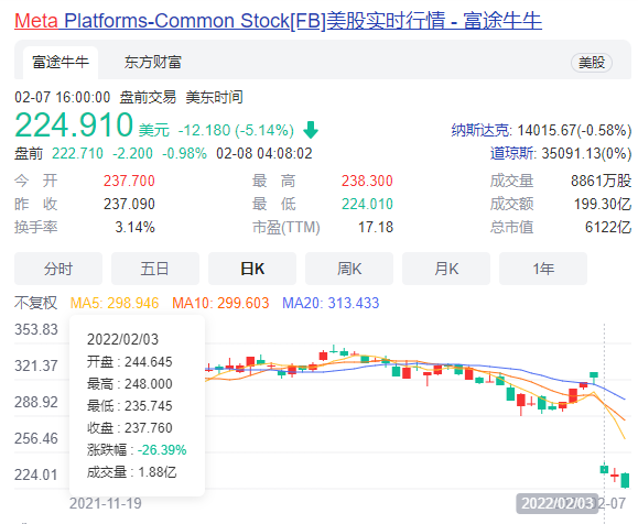 作为元宇宙概念最重要的倡导者,Meta在2月4日的股票市场迎来前所未有的暴跌:盘前就狂跌超24%,当日最终大跌26.39%,市值缩水2371亿美元。而随后几天持续的糟糕表现,说明了市场的负面情绪仍未消解殆尽,截止到北京时间2月8日,累计跌幅达29.5%。