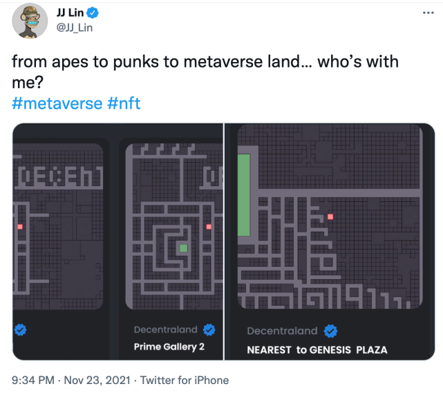 更有甚者,《Decentraland》还可以“炒房”。著名歌手林俊杰就在推特上宣称,自己作为Decentraland的玩家,在其平台上以12.3万美元的价格购买了三块虚拟土地。