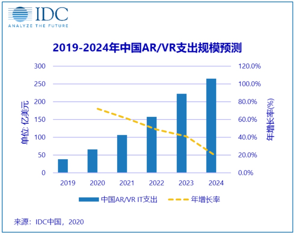 国际数据公司 IDC 也在其发布的《IDC 全球增强与虚拟现实支出指南》预测,中国 AR/VR 市场将于 2024 年达到 250 亿美元的市场规模,年增长率达到 20%。