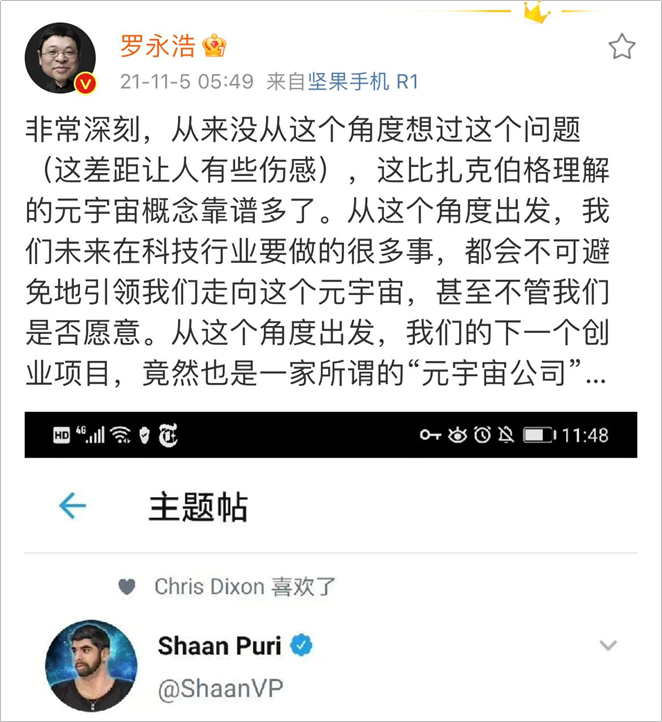 2021 年 11 月 5 日早上,罗永浩发微博表示,“我们的下一个创业项目,竟然也是一家所谓的元宇宙公司”,该条微博引来多方猜测,大家纷纷议论,“行业明灯罗老师这回的创意到底是否能成功”。