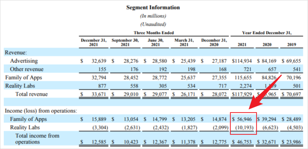 据 Meta 最新财报显示,旗下专攻“元宇宙”的 Reality Labs 部门 2021 年亏损约 101.93 亿美元。
