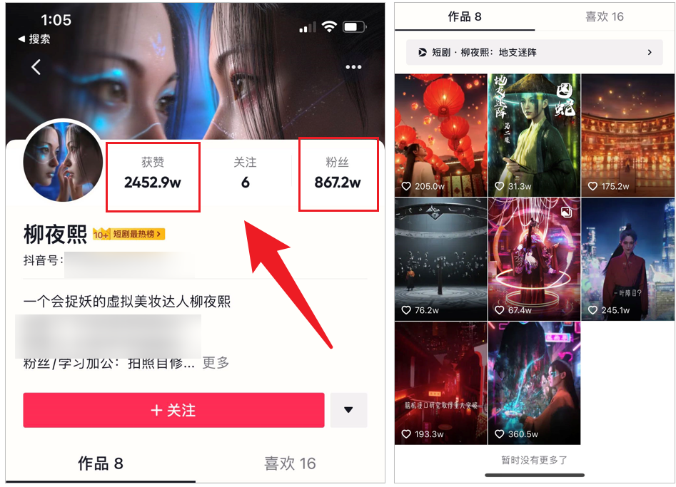 截至发文,@柳夜熙 共上传了 8 条视频,累积粉丝数量 867.2w,获赞 2452.9w。