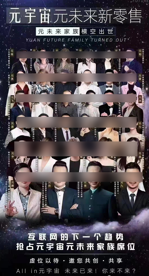 也有众多微商联合而成的“元家族”(微商们把姓氏都改成了“元”,并称自己为元未来新零售,准备“All in 元宇宙”)。