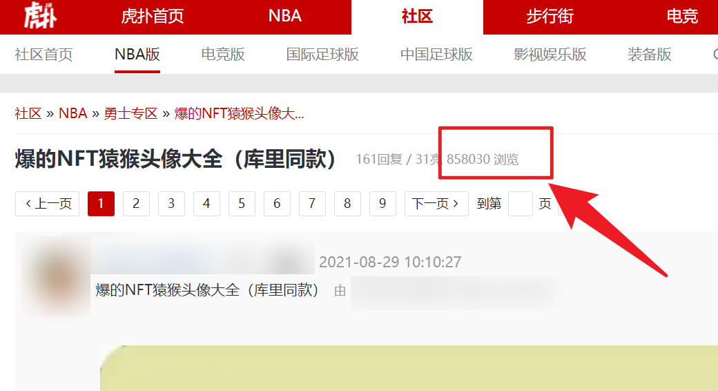 在虎扑社区中,关于库里同款的的 NFT 头像讨论,浏览量近 85w+,属于「勇士专区」的热度话题。