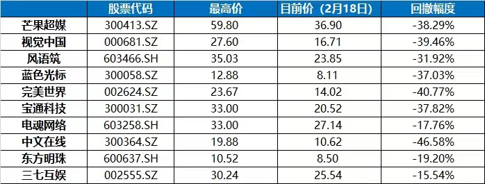比如,主打元宇宙概念的游戏公司“中青宝”,其股价也从最高价 42.64 元跌至 26.34 每股。( 2 月 18 日收盘价),回撤幅度达 40% 左右。