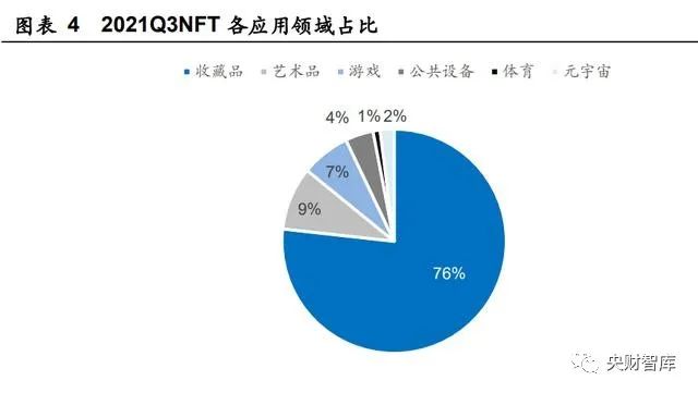 NFT 已应用于收藏品、艺术品、游戏、公共设备等多类资产,NFT 资产推陈出 新使产业链结构不断完善。根据 Nonfungible 统计,2021Q3NFT 在收藏品领域应用 占比超过 75%,艺术领域占比 9%,游戏领域占比 7%。