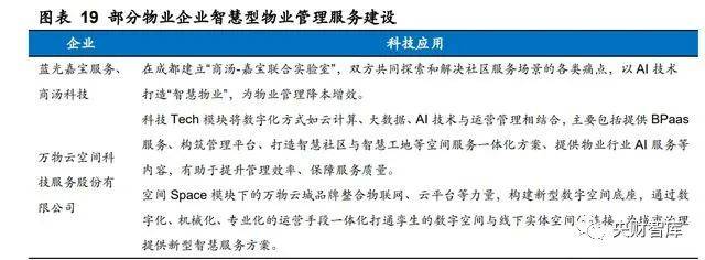 房地产科技已在物业管理服务有所应用,“元宇宙”加盟有望进一步赋能。物业 行业本身涉及的房地产、个人与本地服务、酒店服务和建筑类行业的数字化处于较 低水平,数据化、信息化、数字化、智能化这“四化”的建设投入和布局的竞争已经成 为多数物企“突破天花板”的核心战场。同时,2020 年政策对物业管理着力点在“上层结构”,多次提 出加强智慧物业管理服务能力建设,提高服务质量和标准化水平。于是近年来,越来越多的物业企业开始 运用科技手段打造智慧型物业管理服务。商汤科技与蓝光嘉宝服务运用 AI 技术构建 “智慧物业”品牌,万物云助力“物业+科技”,打造数字化模式为物业管理、城市治理提 供新方案。