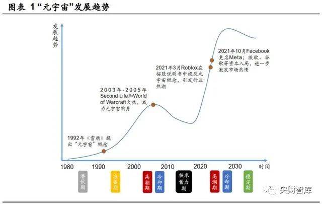 起源于《雪崩》,Roblox 掀起热潮,Meta 等资本入局进一步推向高潮。2021年“元宇宙”成功入选由国家语言资源监测与研究中心发布的“2021 年度十大网络 用语”,其火爆程度可见一斑。发展历程基本可分为以下三阶段: