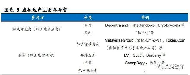 虚拟地产的主要参与者为游戏开发商和各类地产买方,元宇宙概念兴起下买方 范围广泛。游戏开发商是虚拟土地的供应商,在游戏中构建待开发的土地,买家有 专耕此行业的公司、有广告推广需求的品牌企业、明星,以及抓住热点的散户投资 者,范围广泛,数量渐增。